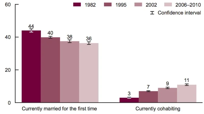 Current marital and cohabiting status among women under 44 years of age, United States: 1982, 1995, 2002, and 2006–2010. From Copen C. et al. First Marriages in the United States: Data From the 2006–2010 National Survey of Family Growth. National Health Statistics Report 49. March 2012.