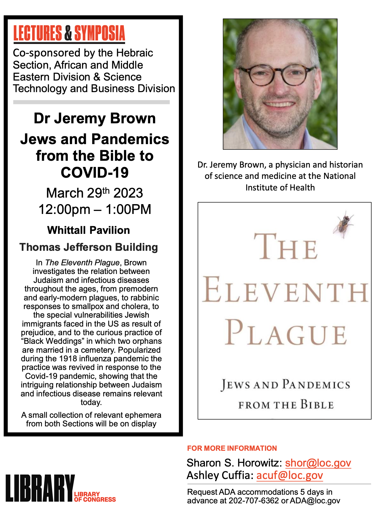On March 29, 2023 I gave a talk at the Library of Congress on my new book The Eleventh Plague: Jews and Pandemics from the Bible to COVID-19. The event was graciously sponsored by the the Hebraic Section of the African and Middle Eastern Division. The talk was held in the Library's magnificent Whittall Pavilion, where several works from the Library’s works collection that feature in the book were on display.